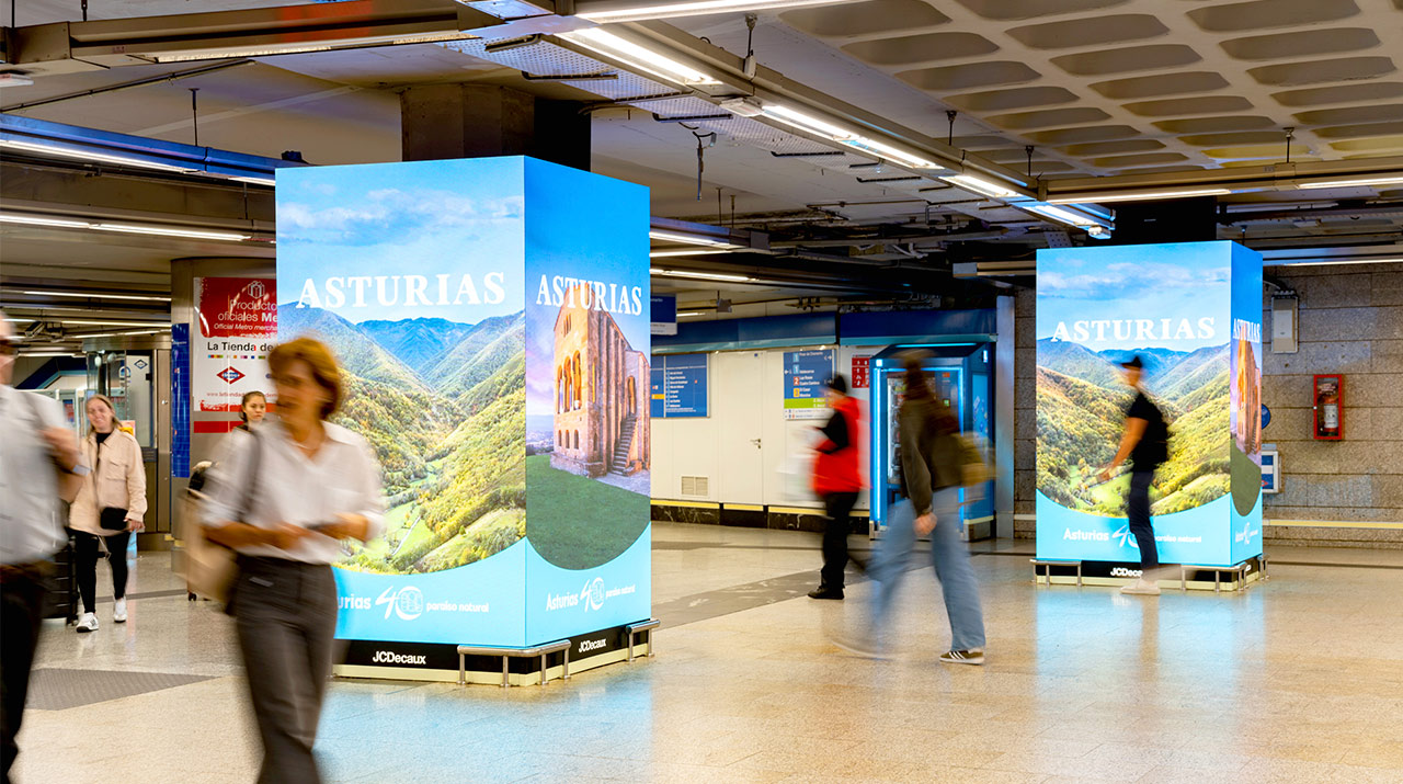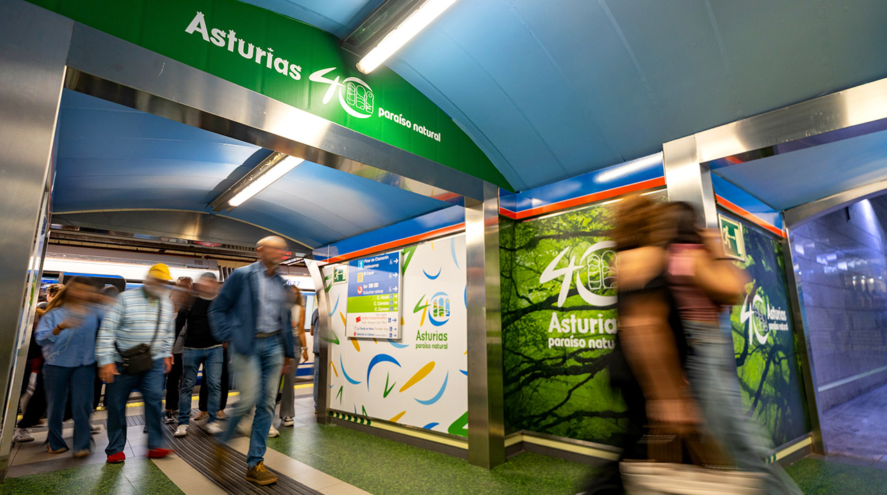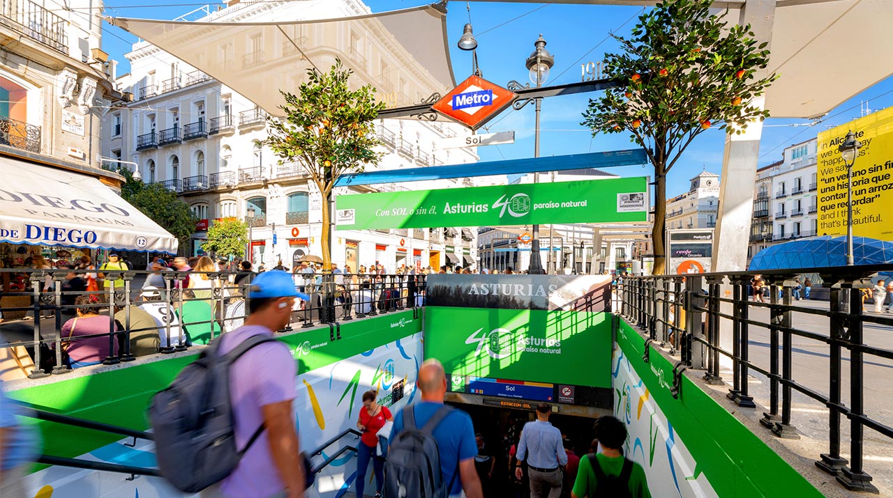 MadridDe la mano de Turismo de Asturias, se ha transformado la estación de Sol en un paisaje asturiano. Los corpóreos con flores silvestres y plantas aromáticas llenan el espacio con un aroma vegetal y auténtico que evoca a la tierra mojada y los bosques infinitos del Principado. Además, el sonido de la naturaleza asturiana acompaña, creando una experiencia multisensorial única. Esta acción inmersiva se complementa con un impactante pórtico exterior personalizado y una fuerte presencia digital en toda la estación que garantiza un impacto 360º.